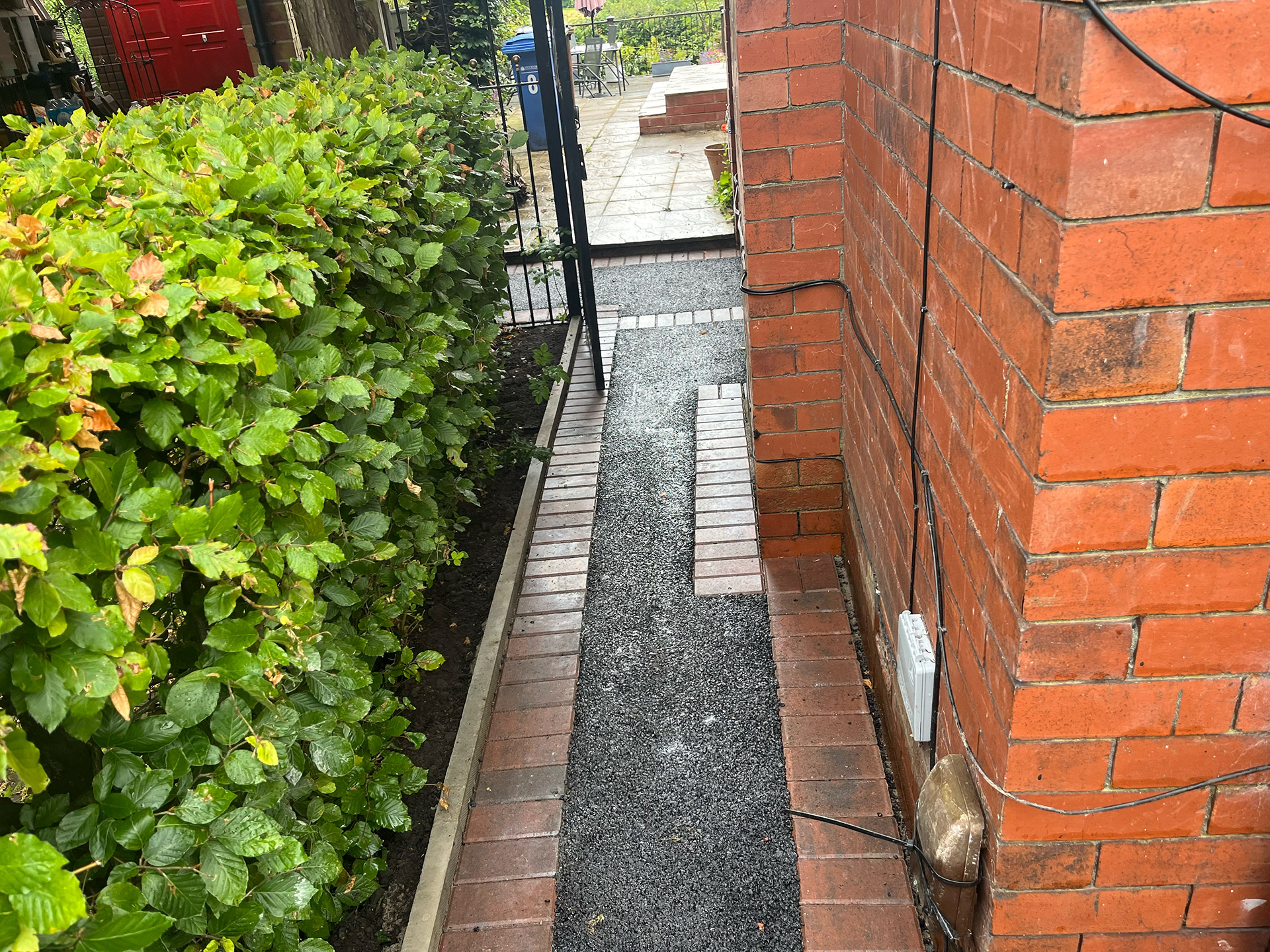 The existing driveway and pathways were carefully removed, and the ground was levelled to create a solid foundation for the new surfaces.